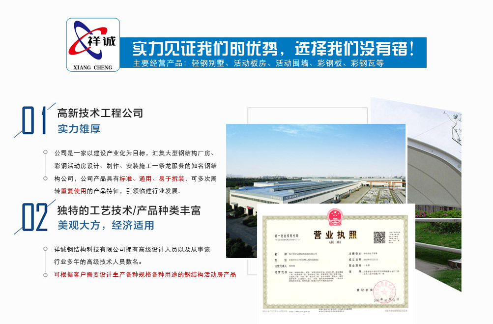 宿州市祥誠鋼結構科技有限公司位于宿州市經開區外環南路與金江二路交叉口北,公司是一家以建設產業化為目標,匯集大型鋼結構廠房、彩鋼活動房設計、制作、安裝施工一條龍服務的知名鋼結構公司。公司現有固定資產1000余萬元、流動資金近千萬元公司。現有員工40人,大專以上學歷30人,其中高級工程師1人、工程師2人、會計師1名。各工種持證上崗率100%。高效化的年青團隊為公司帶來了蓬勃發展的動力,全體員工以務實的態度,拼搏的精神,創造著企業的每一天。      公司組織結構嚴格按現代企業制度設計,管理機構設置合理,制度完善,各部門分工明確...